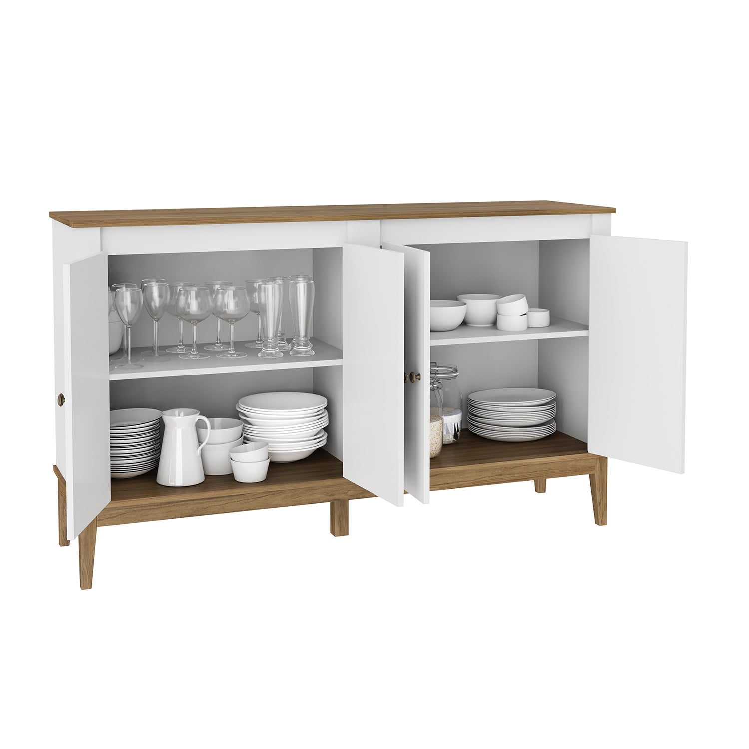 El aparador buffet 4 puertas Colonial tiene una parte superior funcional como repisa elaborada de MDP de 15mm que proporciona aún más encanto y refinamiento al mueble. Tiene cuatro puertas con manijas y cierre magnético en cada puerta, bisagras de metal y 2 repisas internas, sus patas son de madera maciza, lo que garantiza aún más calidad y resistencia al producto. Pintura ultravioleta con acabado semi brillante.