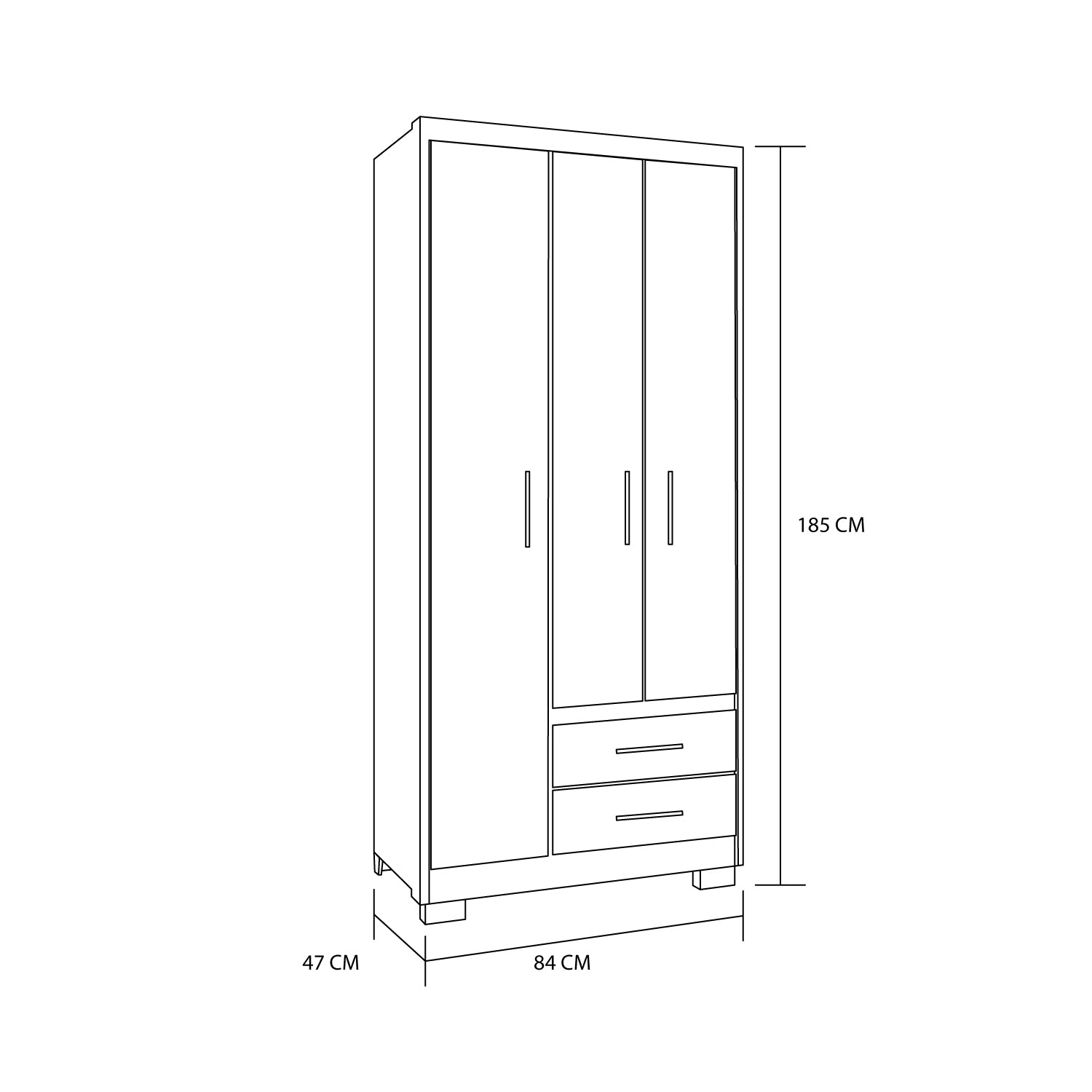 Un dormitorio completo requiere un buen clóset. El primacy además de ser muy útil para mantener la ropa ordenada, también le da un toque especial al espacio. Cuenta con 3 puertas y 2 cajones, en su interior posee 4 repisas y un perchero metálico donde podrá organizar y guardar sus pertenencias sin preocuparse por el espacio. Producto elaborado en excelente material de MDP de 15 mm y 12 mm con acabado de lámina satinada. Posee manijas y patas de plástico, bisagras y correderas metálicas lo que garantiza una mayor resistencia y calidad en su mueble.