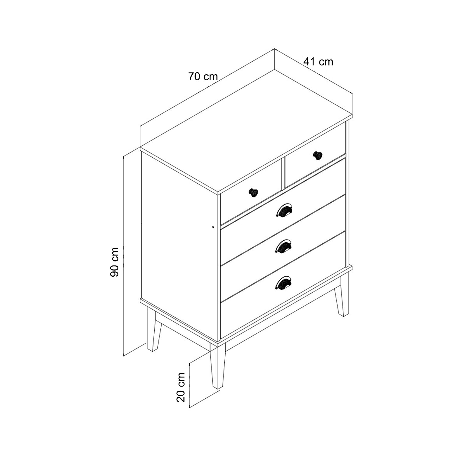 La cómoda 5 cajones colonial tiene un diseño retro a contemporáneo que brinda un ambiente sofisticado. Tiene cinco cajones con correderas metálicas y tiradores tipo concha que le hacen lucir el toque retro, sus patas son de madera maciza. Esta elaborado en un material de MDP de 15 mm con un acabado UV semi brillante es un excelente material de óptima calidad y máxima durabilidad.
