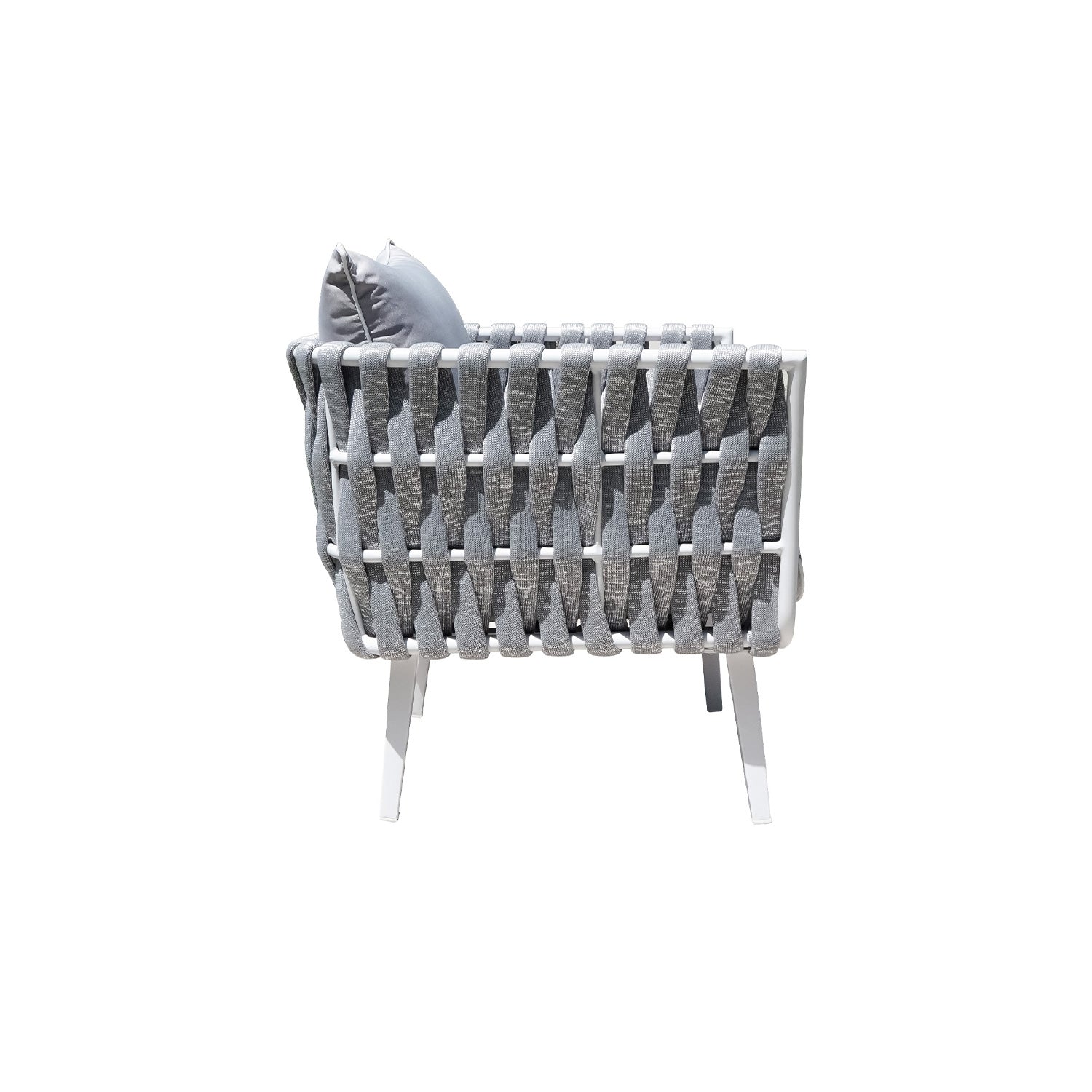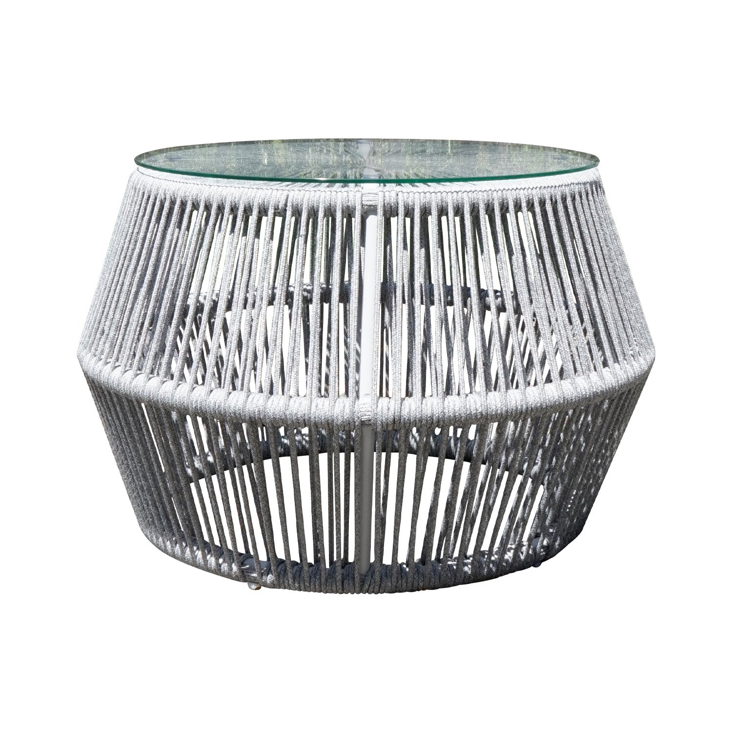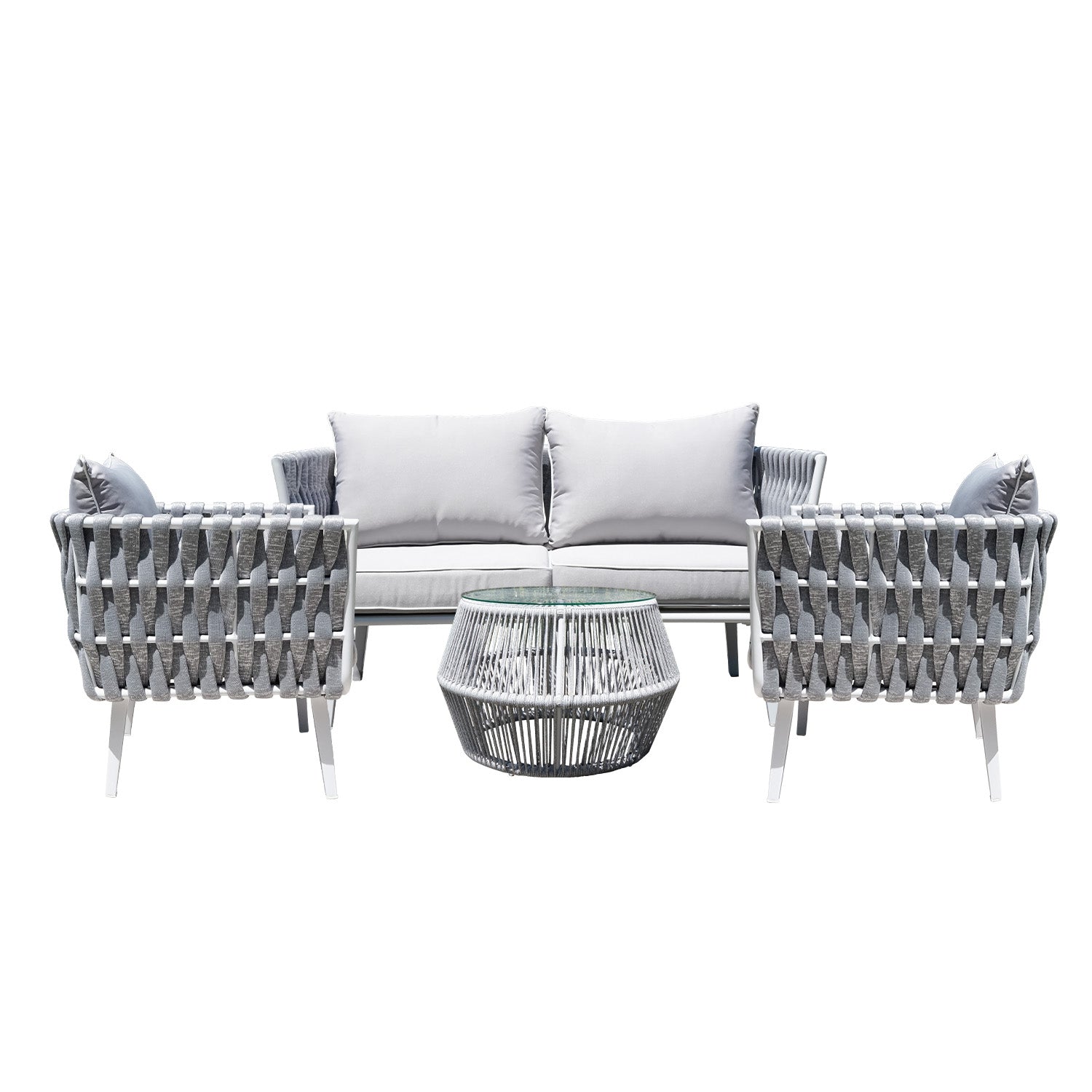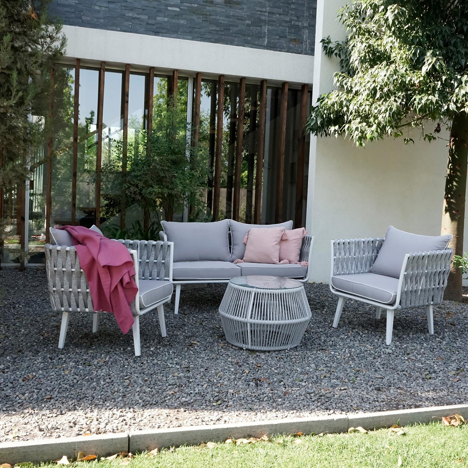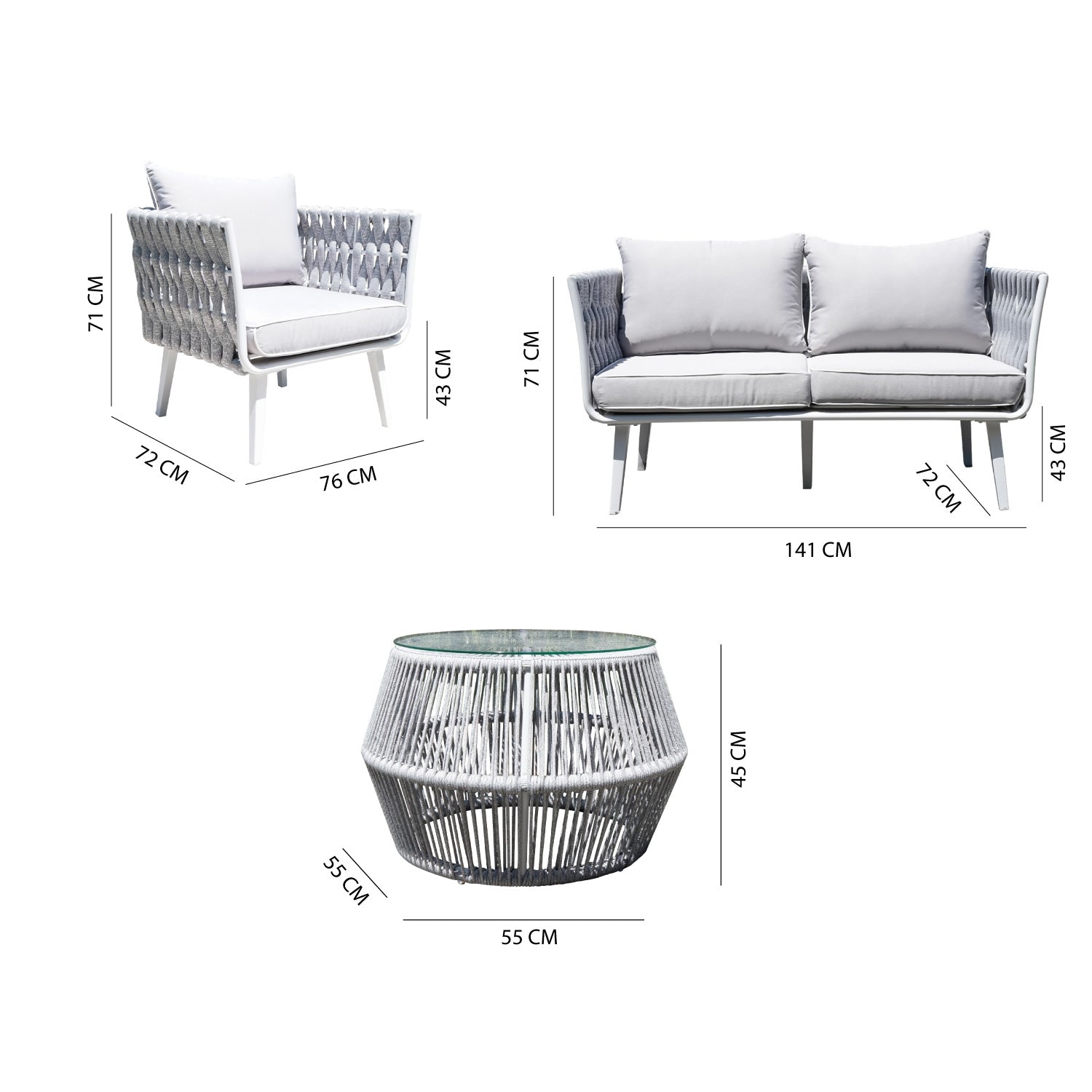 El juego de terraza sorrento con un estilo contemporáneo destaca por su elegancia y tonos grises. Este maravilloso set de uso exterior cuenta con un sofá de 2 cuerpos y dos sillones con estructura de aluminio y cuerda entrelazadas que cubren sus respaldos y brazos; su tapicería es de poliéster y espuma de secado rápido. Mesa de centro redonda con una estructura de aluminio y cuerda entrelazadas con vidrio.