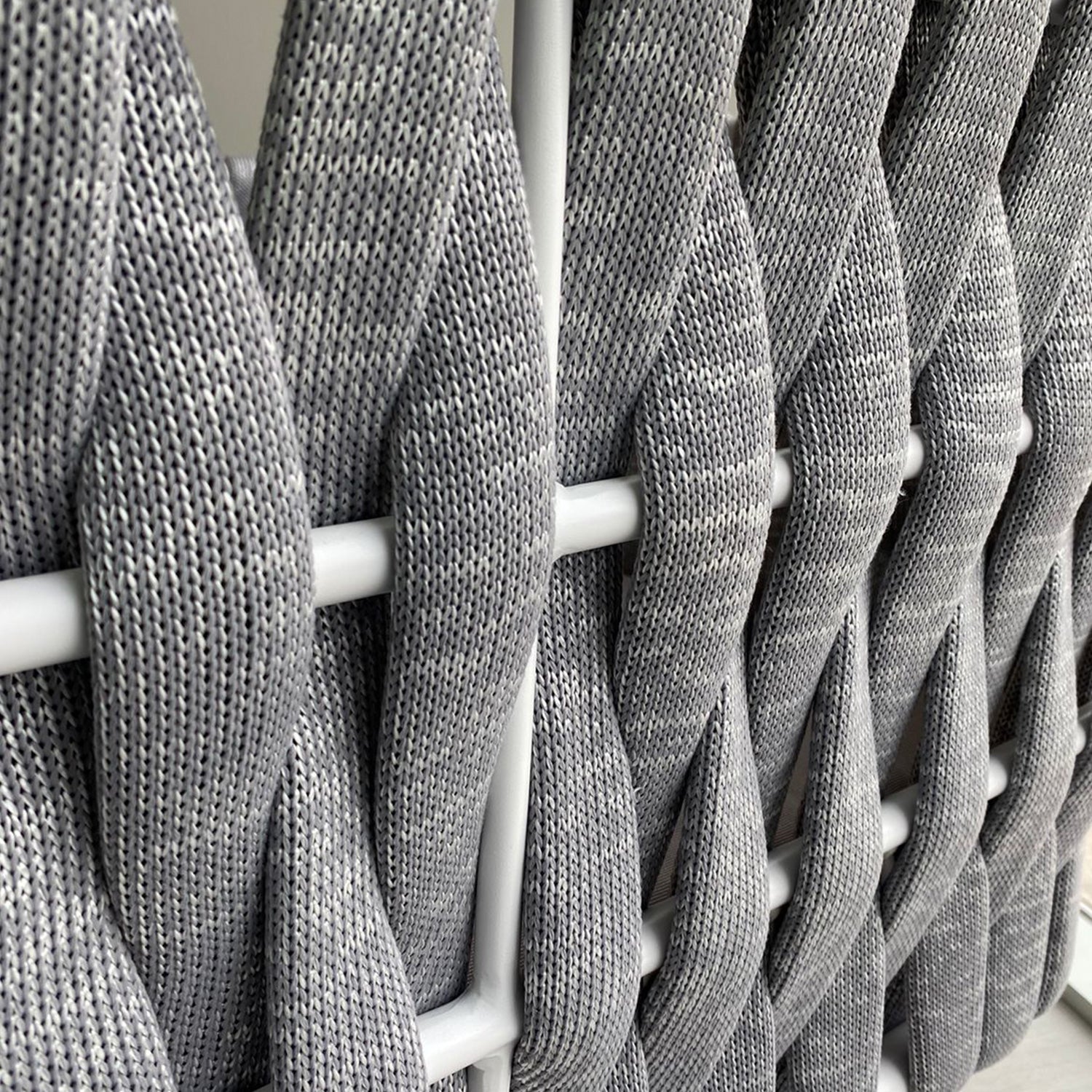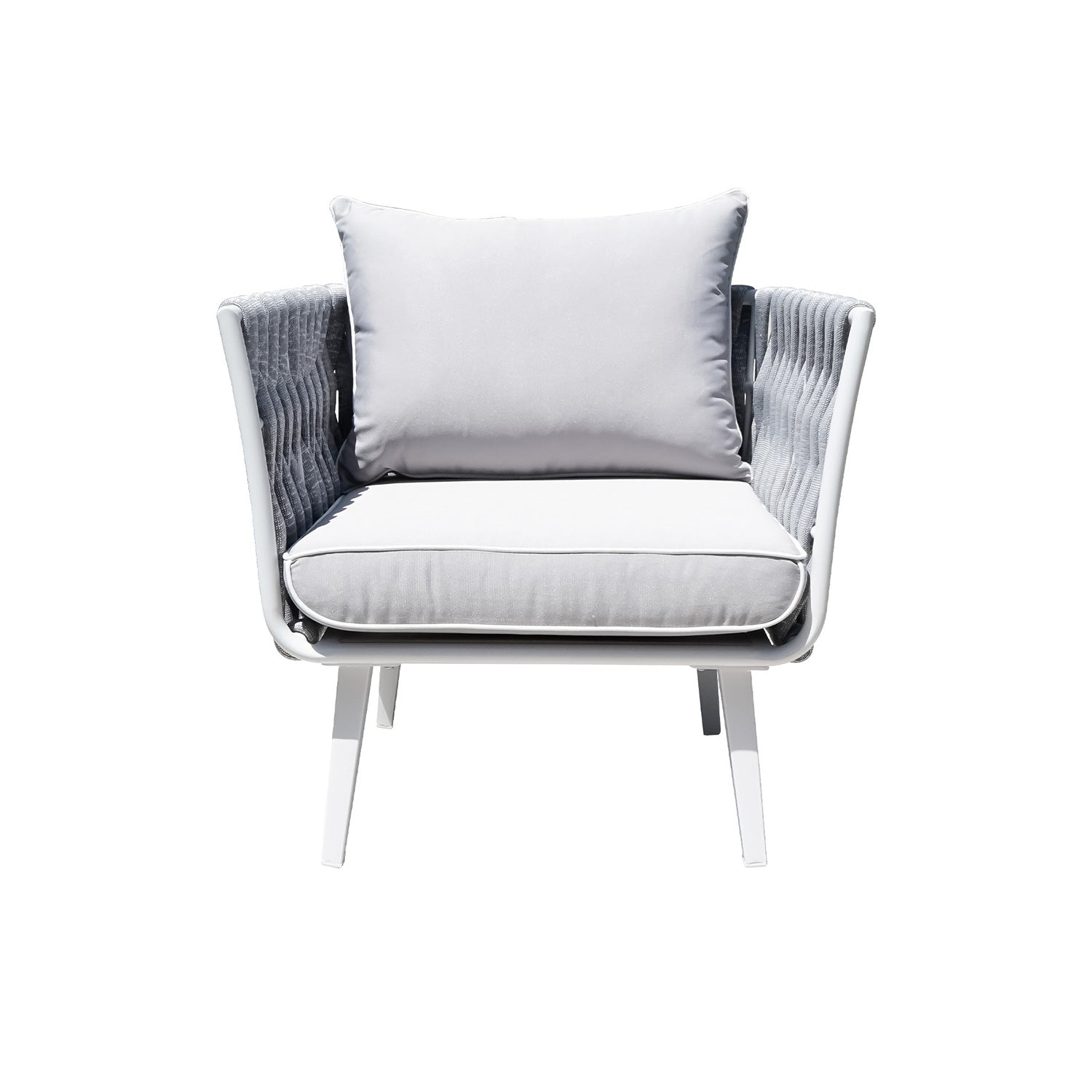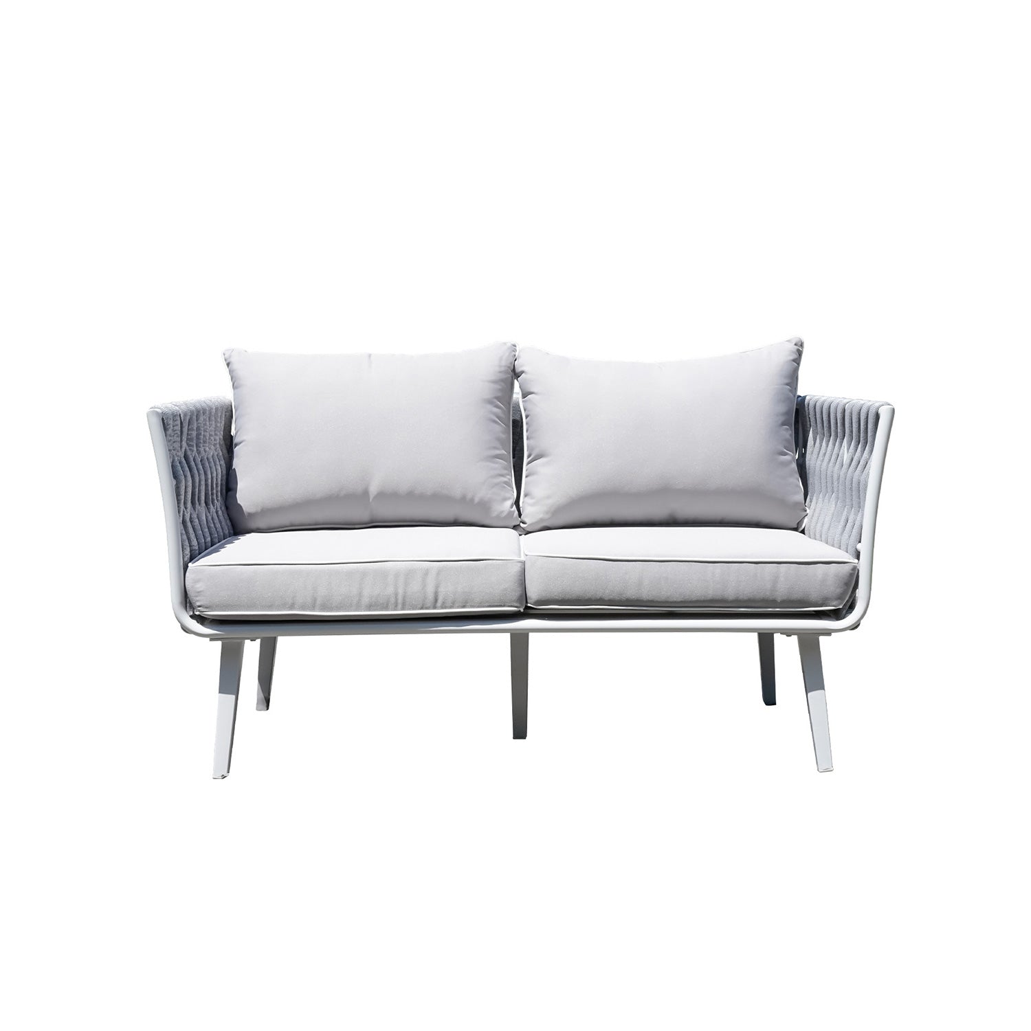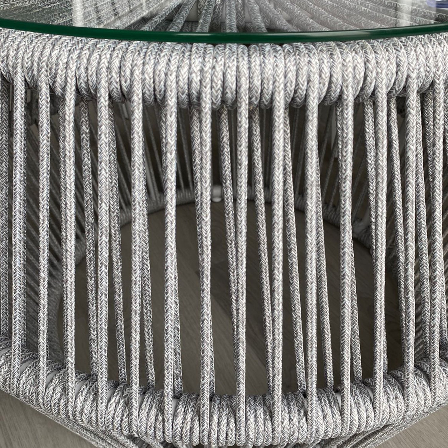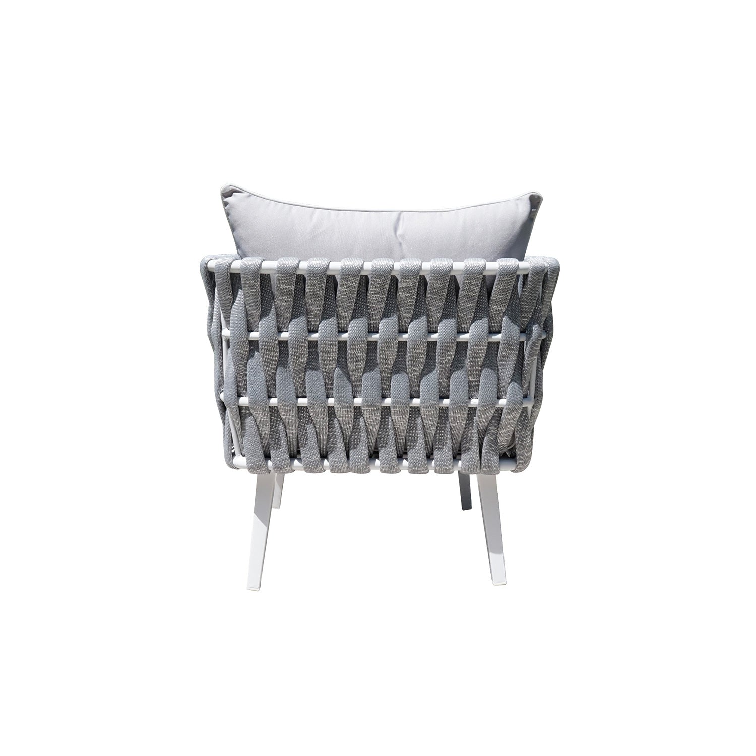 El juego de terraza sorrento con un estilo contemporáneo destaca por su elegancia y tonos grises. Este maravilloso set de uso exterior cuenta con un sofá de 2 cuerpos y dos sillones con estructura de aluminio y cuerda entrelazadas que cubren sus respaldos y brazos; su tapicería es de poliéster y espuma de secado rápido. Mesa de centro redonda con una estructura de aluminio y cuerda entrelazadas con vidrio.