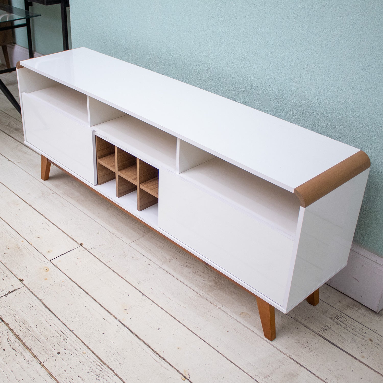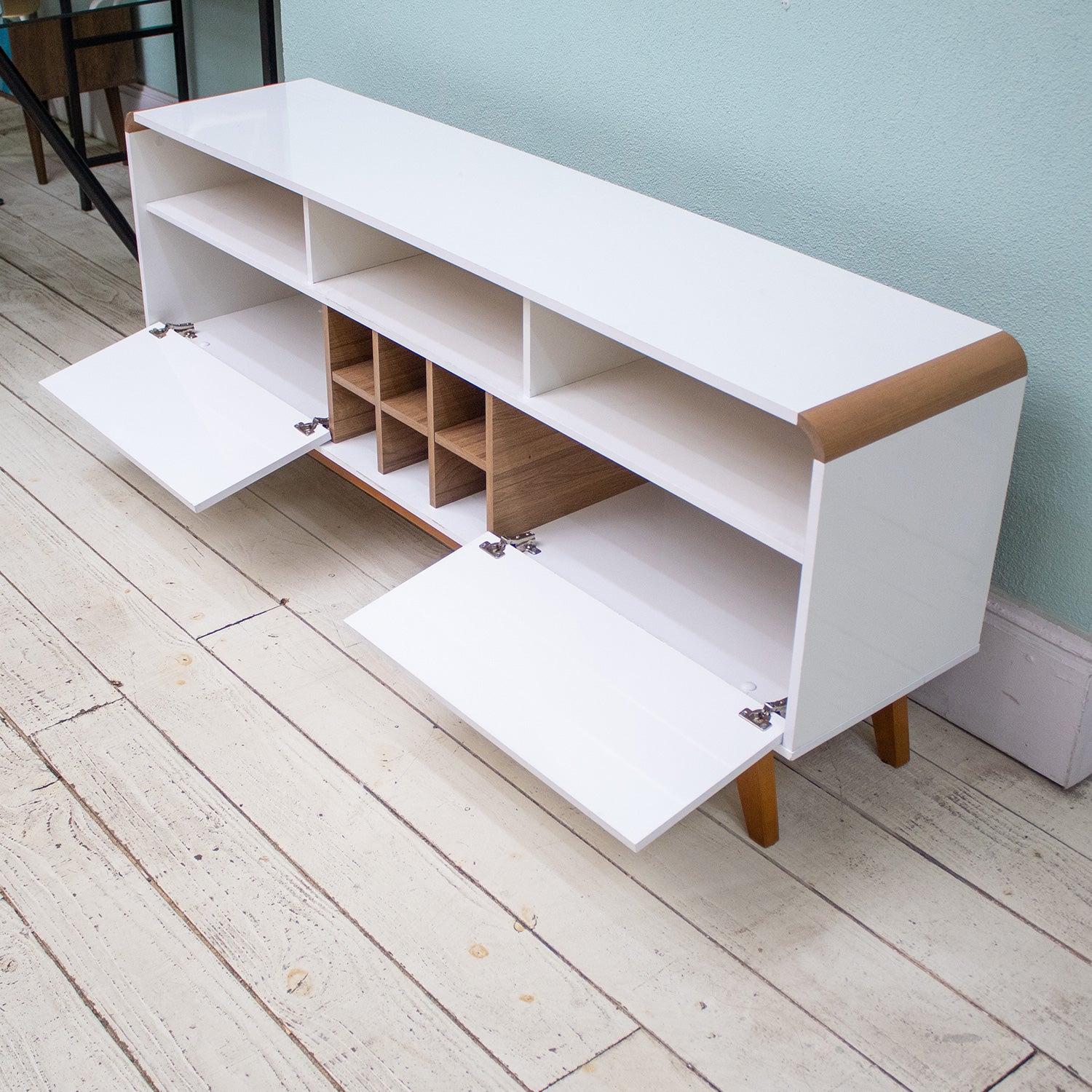 El rack larimar para tv de hasta 65 pulgadas es ideal para tu sala de estar, con un diseño retro que se alinea con las esquinas agregará mucho más encanto y refinamiento a tu entorno. Amplio espacio para dispositivos electrónicos, varios nichos en la parte central para colocar las bebidas y puertas con bisagras metálicas. Patas de madera maciza que otorgan al producto una mayor resistencia y durabilidad. Esta elaborado en un material de MDP de 15 mm y otros componentes de la estructura en MDP de 12 mm lo que garantiza la calidad. Con un acabado en pintura con textura ultravioleta semi brillante.