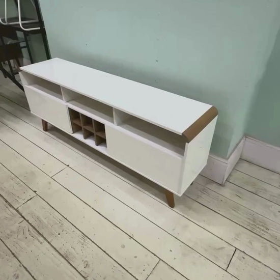 El rack larimar para tv de hasta 65 pulgadas es ideal para tu sala de estar, con un diseño retro que se alinea con las esquinas agregará mucho más encanto y refinamiento a tu entorno. Amplio espacio para dispositivos electrónicos, varios nichos en la parte central para colocar las bebidas y puertas con bisagras metálicas. Patas de madera maciza que otorgan al producto una mayor resistencia y durabilidad. Esta elaborado en un material de MDP de 15 mm y otros componentes de la estructura en MDP de 12 mm lo que garantiza la calidad. Con un acabado en pintura con textura ultravioleta semi brillante.