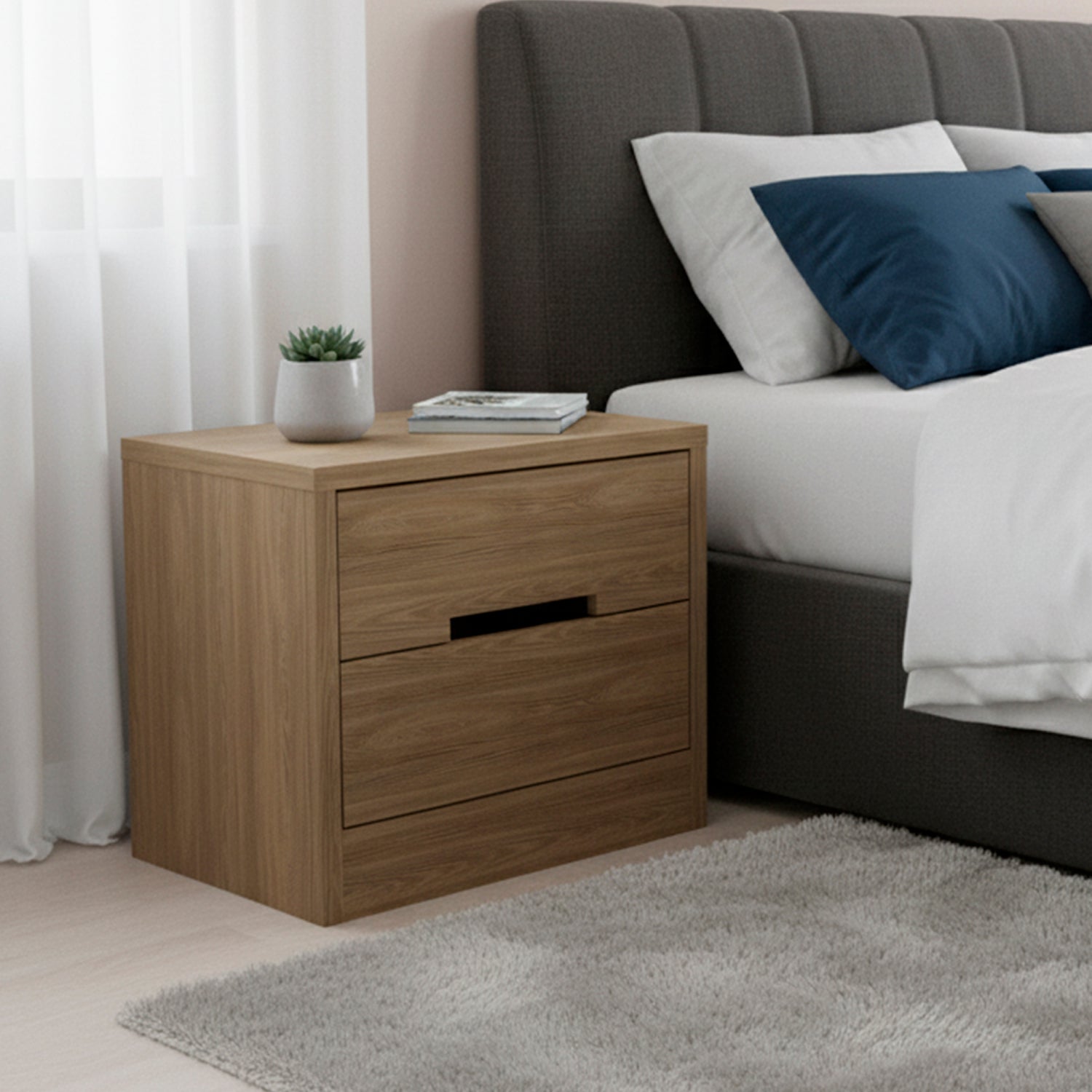 El velador genova de 2 cajones es ideal para acomodar pequeños objetos decorativos o libros y otros artículos que deben estar a la mano. Sus cajones también le permiten almacenar artículos personales de una manera más reservada. Producto elaborado en excelente material de MDP de 15 mm y 25 mm en un acabado de pintura UV, correderas metálicas, lo que garantiza una mayor resistencia y calidad en su mueble.