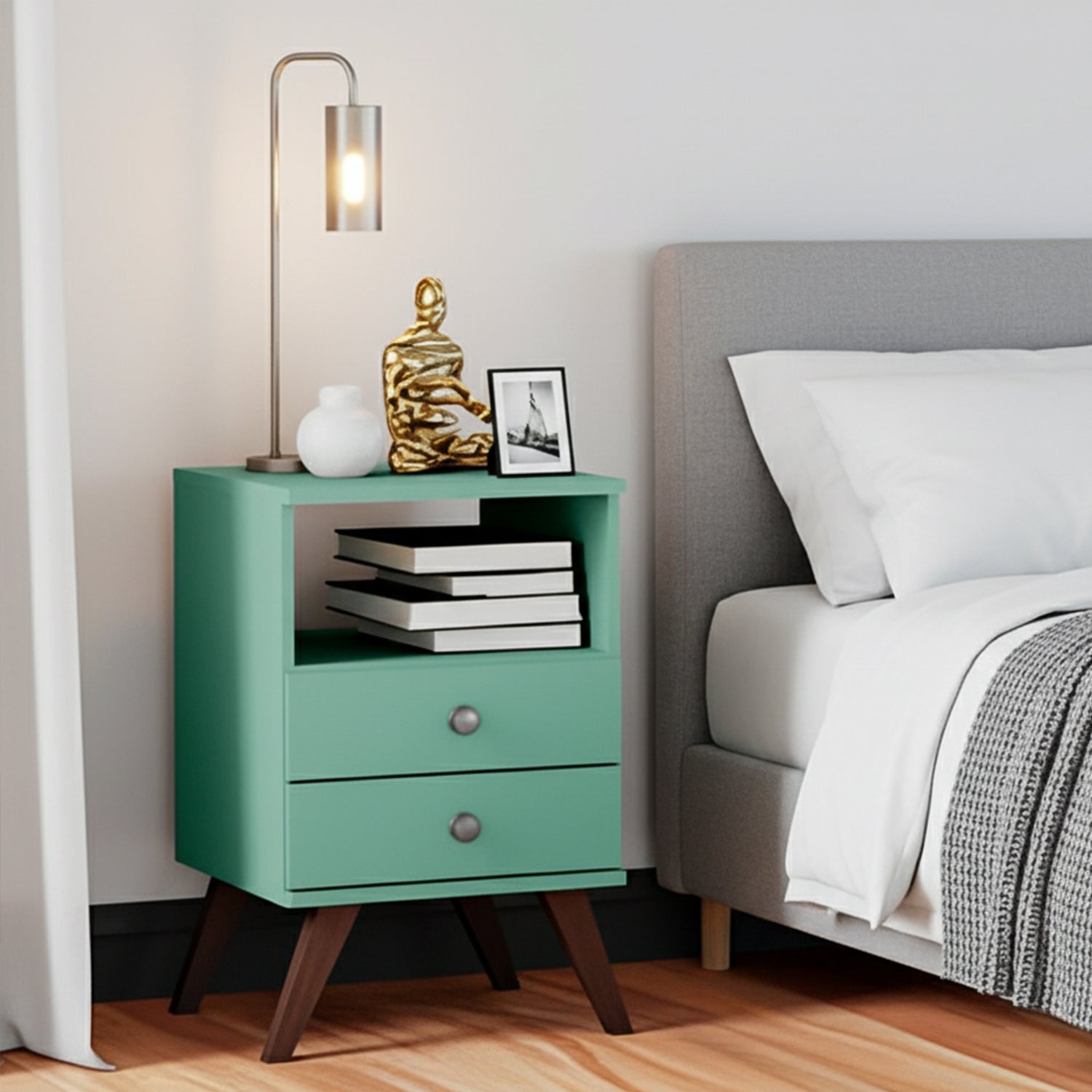 El velador retro no puede faltar en la habitación, ayuda a componer el estilo del entorno y sigue siendo súper funcional, pudiendo acomodar varios objetos de uso personal haciendo que tu habitación sea aún más bella y elegante. Elaborado en un material MDP de 15 mm con recubrimiento de pintura ultravioleta. Contiene 2 cajones, 1 estante, patas de plástico (polímero), correderas metálicas y tiradores plásticos que añaden en él encanto en cualquier lugar que se coloque.